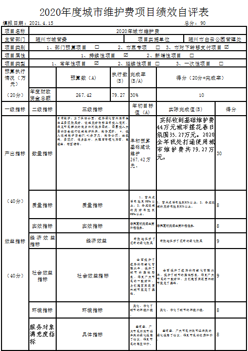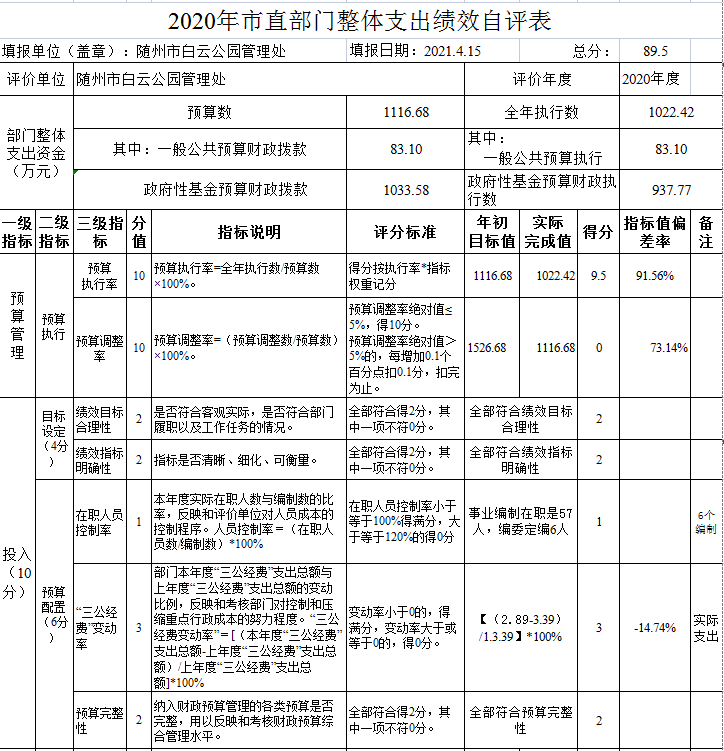 2.整體支出績(jī)效評(píng)價(jià),自評(píng)得分89.5分。附《2020年度白云公園部門(mén)整體績(jī)效自評(píng)報(bào)告》摘要版和《2020年度白云公園部門(mén)整體部門(mén)自評(píng)表》