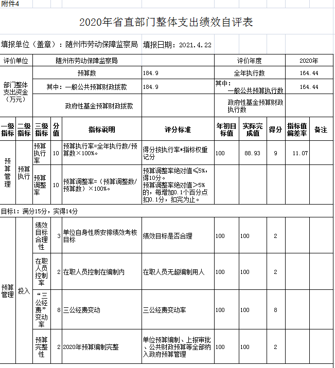 隨州市勞動保障監(jiān)察局2020年度部門整體支出績效評價項目設立了明確、細化、量化的績效目標,在績效依據及績效目標安排上符合相關規(guī)定??冃гu價結果級別為優(yōu),單位各項管理制度齊全,并得到了有效地實施,社會效益明顯,公共服務水平社會滿意度高。