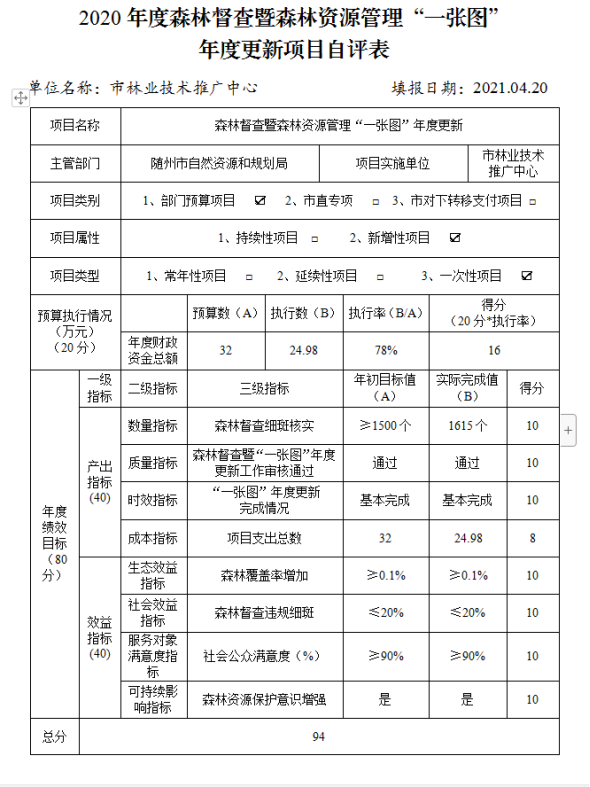 1. 2020年度森林督查暨森林資源管理“一張圖”年度更新項目自評:項目全年預(yù)算數(shù)為32萬元,執(zhí)行數(shù)為24.98萬元,執(zhí)行率78%。產(chǎn)出指標完成情況:2020年森林督查核實細斑1615個,其中違規(guī)細斑252個;森林督查暨“一張圖”年度更新工作完成并審核通過。效益指標完成情況:森林覆蓋率增加到52.92%,公眾滿意度和森林資源保護意識不斷提高。存在的問題及原因:因項目資金下達時間較晚,導(dǎo)致森林督查暨森林資源管理“一張圖”年度更新項目未完全收尾。項目總體工作已基本完成,將在2021年做好收尾工作。下一步改進措施:將積極督促各縣(市、區(qū))根據(jù)森林督查核實數(shù)據(jù)及時開展尾期工作,以便工作順利完成;進一步加強與市局、市財政局對接,做好預(yù)算工作,爭取項目資金及時下達,推進工作按時開展。