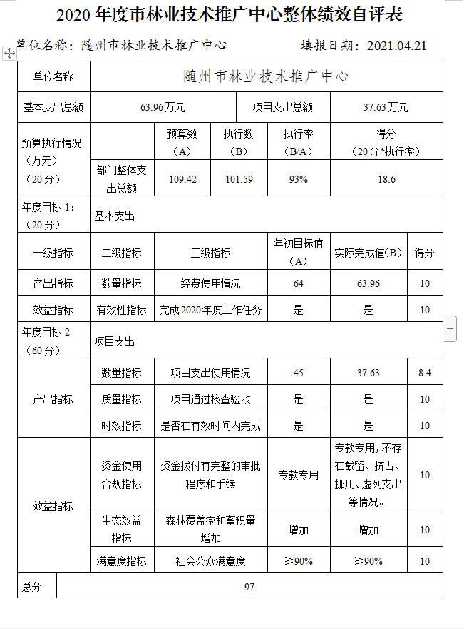 組織開展部門整體績效評價,評價情況來看,整體績效自評得分為97分,我單位完成森林督查暨森林資源管理“一張圖”更新和“十四五”期間年森林采伐限額編制工作;積極完成市局等交辦工作,保證單位正常運轉(zhuǎn)。資金撥付有完整的審批程序和手續(xù),專款專用,不存在截留、擠占、挪用、虛列支出等情況。