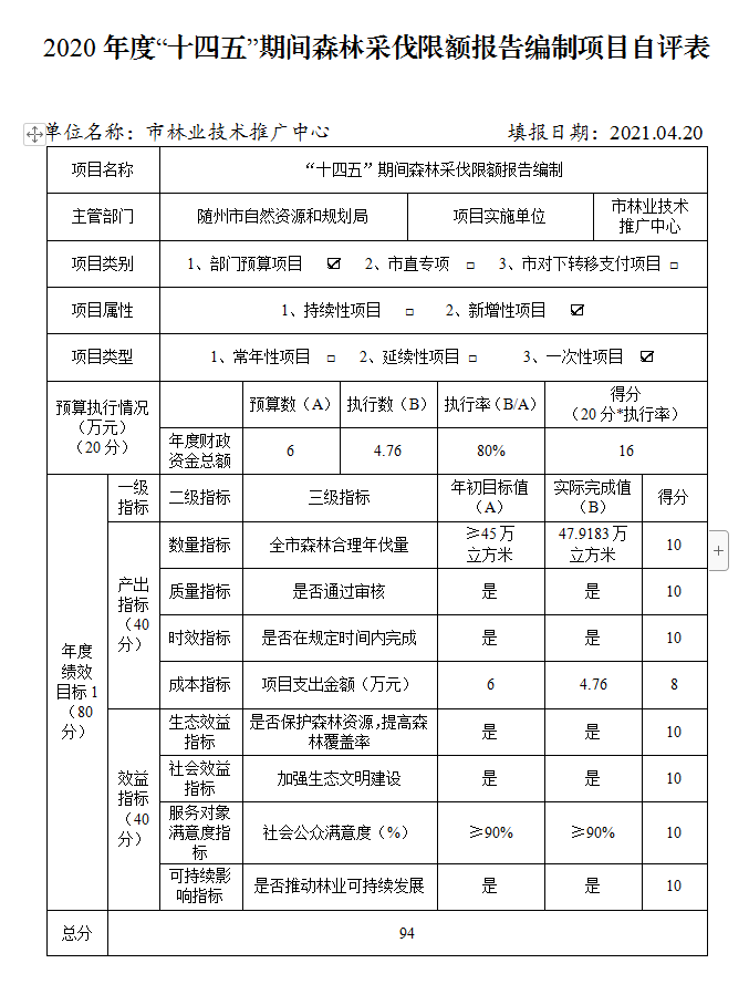 (一)預(yù)算績效管理工作開展情況。根據(jù)預(yù)算績效管理要求,我單位組織對2020年度一般公共預(yù)算項目支出全面開展績效自評,共涉及項目2個,資金38萬元,占一般公共預(yù)算項目支出總額的84%。從評價情況來看,我單位通過積極和隨縣、廣水市、曾都區(qū)、高新區(qū)、大洪山風景名勝區(qū)、大洪山林場等6個編限單位的溝通和對接,利用“森林合理年采伐量測算系統(tǒng)”測算出合理年采伐量,“十四五”期間森林采伐限額報告編制結(jié)果通過省局審核。積極開展2020年森林督查暨森林資源管理“一張圖”項目,數(shù)據(jù)庫建設(shè)和成果報告編制,整合更新公益林區(qū)劃落界成果,銜接一張圖字段屬性一致性,整合并更新森林資源管理一張圖”數(shù)據(jù)庫。為林業(yè)實施成效提供有力的數(shù)據(jù)參考。