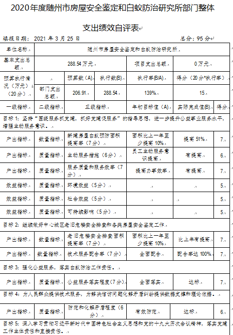 通過評價分析,2020年市房屋安全鑒定和白蟻防治研究所整體支出績效自評報告績效評價綜合得分為95分,評價等級為優(yōu)。其中預(yù)算執(zhí)行情況得分15分,產(chǎn)出指標(biāo)得分59分,效益指標(biāo)得分15分、約束性指標(biāo)得分6分。