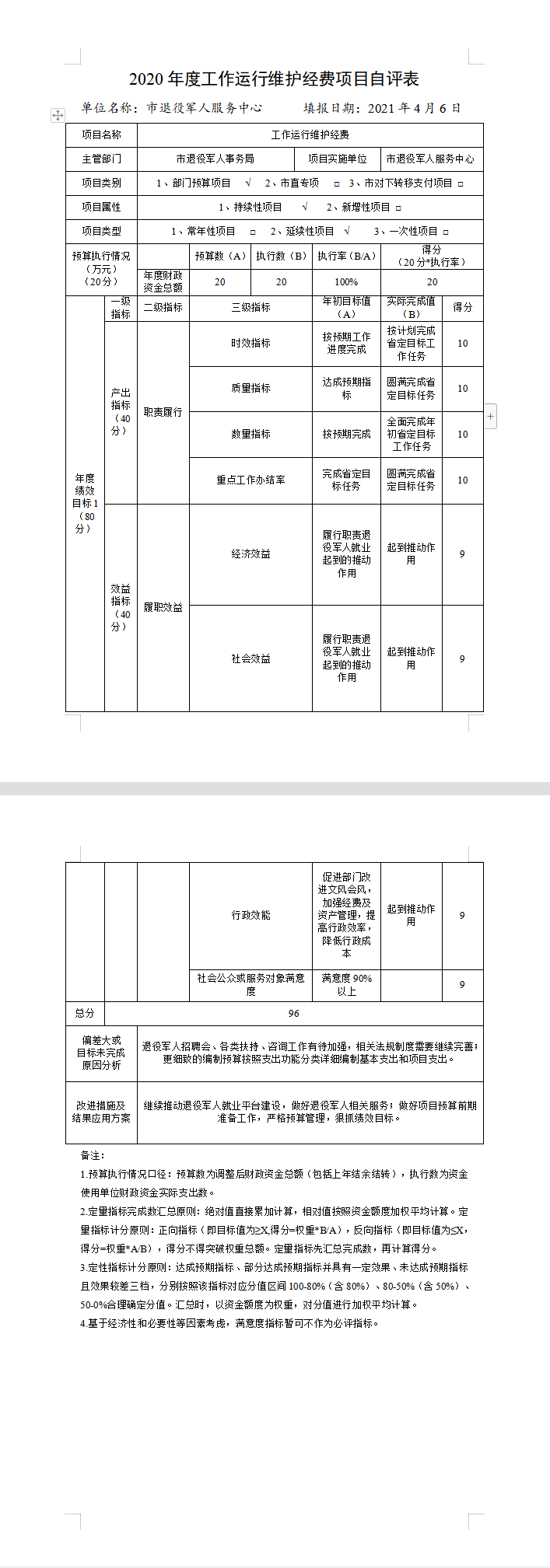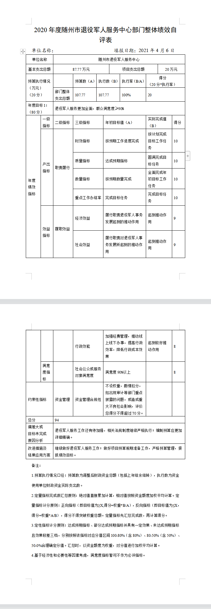 ????根據《2020年市直部門整體支出績效自評表》中績效指標分析評分,隨州市退役軍人服務中心2020年部門整體支出績效自評得96分,績效等級為優。?????????????