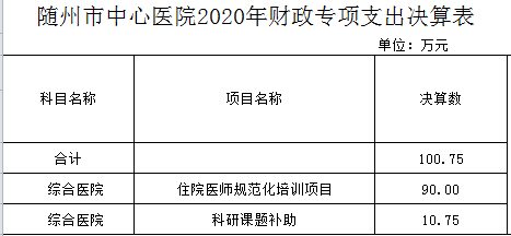 2020年我院財(cái)政專項(xiàng)支出如下: 2020年住院醫(yī)師規(guī)范化培訓(xùn)項(xiàng)目支出90萬(wàn)元,比上年同期461萬(wàn)元減少371萬(wàn)元,減少率為80.49%。2020年科研項(xiàng)目支出10.75萬(wàn)元,比上年同期3.25萬(wàn)元增長(zhǎng)7.5萬(wàn)元,增長(zhǎng)率為230.77%。
