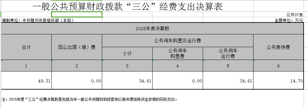 2015年,市委組織部認(rèn)真落實(shí)中央八項(xiàng)規(guī)定、國(guó)務(wù)院“約法三章”和省委、省政府及市委、市政府有關(guān)文件精神,厲行節(jié)約,精減會(huì)議,合理壓縮一般行政性開(kāi)支,嚴(yán)格控制“三公”經(jīng)費(fèi)支出,切實(shí)減少各項(xiàng)經(jīng)費(fèi)開(kāi)支。