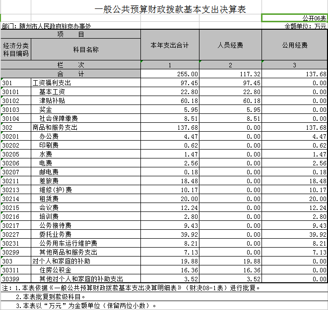 全年度行政運行費255.00萬元。其中:工資福利支出97.45萬元,主要用于發(fā)放單位人員工資、津貼及獎勵金;商品與服務(wù)支出137.68萬元,用于單位辦公、印刷、水電費、郵電費、物業(yè)管理、差旅費、日常維修、會議費、公務(wù)接待、公車運行及其他支出等,該項經(jīng)費支出主要保障單位日常工作的正常運行;對個人及家庭補助支出19.88萬元,用于發(fā)放單位退休人員生活費,職工福利費及提取職工公積金。