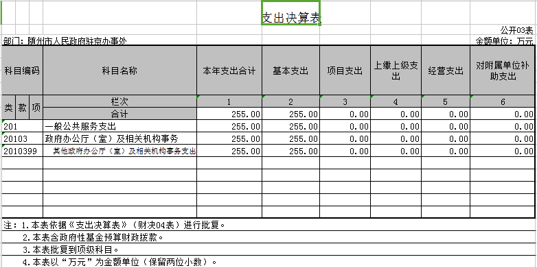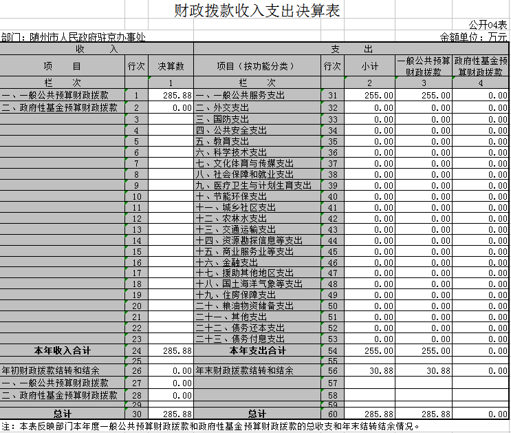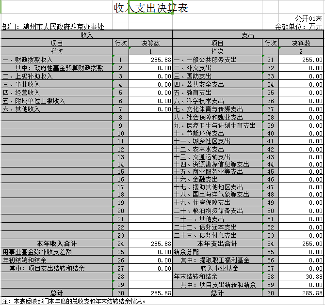 市駐京辦屬全額撥款單位,人員經(jīng)費按現(xiàn)在人員由財政全額保障,本年度收入285.88萬元,上年度結(jié)轉(zhuǎn)無,總支出255萬元,年末結(jié)轉(zhuǎn)和結(jié)余30.88萬元。