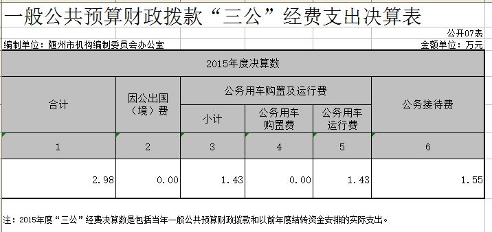 2015年三公經(jīng)費(fèi)支出2.98萬(wàn)元,其中:因公出國(guó)(境)費(fèi)用0萬(wàn)元、公務(wù)用車購(gòu)置及運(yùn)行維護(hù)費(fèi)1.43萬(wàn)元、公務(wù)接待費(fèi)1.55萬(wàn)元。