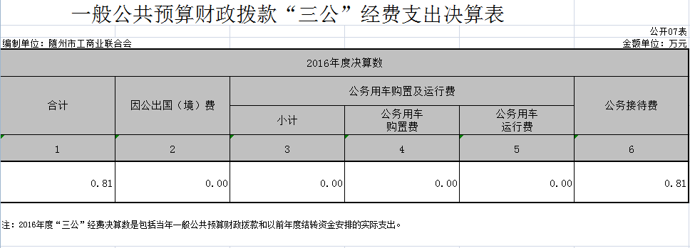 隨州市工商聯(lián)2016年度“三公”經(jīng)費總支出0.81萬元,較去年減少11.66萬元,因無因公出國費用,且未保留公務用車。“三公”經(jīng)費開支具體明細如下: