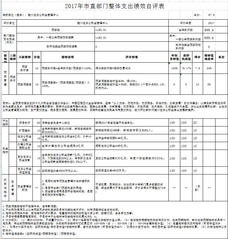 根據預算績效管理要求,隨州住房公積金管理中心認真組織對2017年度一般公共預算項目支出全面開展績效自評,項目預算安排資金合計1180.81萬元,占一般公共預算項目支出總額的100%。從評價情況來看,本單位明確了經費審批權限及程序,經費預算管理、財務經費管理、資產購置與處置、財務監督等,針對“三公經費”建立了公用經費標準定額體系,開展公用經費使用監督和績效評估,進一步落實厲行節約的各項規定,確保“三公經費”使用合理合規。根據《2017年市直部門整體支出績效自評表》中績效指標分析評分,隨州住房公積金管理中心2017年部門整體支出績效自評得97.6分。