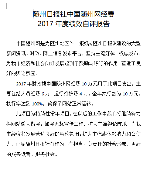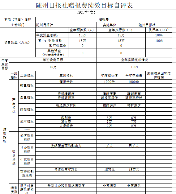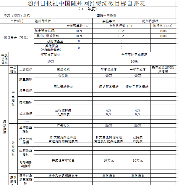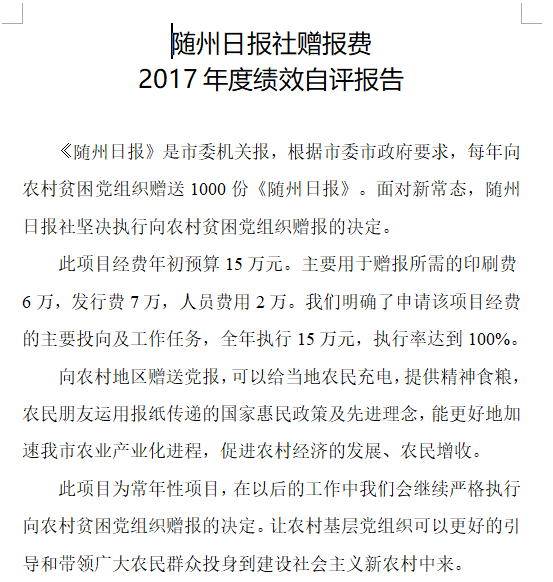我單位對(duì)兩個(gè)項(xiàng)目進(jìn)行了績(jī)效自評(píng),分別為中國(guó)隨州網(wǎng)經(jīng)費(fèi)和贈(zèng)報(bào)費(fèi)。年初預(yù)算數(shù)分別為10萬元和15萬元,全年執(zhí)行數(shù)共計(jì)25萬元,完成預(yù)算的100%。項(xiàng)目主要效果:一是擴(kuò)大了主流輿論陣地,為我市經(jīng)濟(jì)和發(fā)展?fàn)I造良好的輿論氛圍。二是擴(kuò)大主流媒體影響力和公信力。三是更好的服務(wù)讀者、服務(wù)社會(huì)。