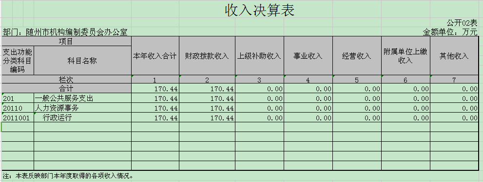 1、決算收入總計177.04萬元,較年初預算數增加16.96萬元,增長10.6%;決算收入比2016年增加9.9萬元,增長5.9%。主要原因是人員增加,業務量增長。其中財政撥款170.44萬元,占96.2%;年初結轉和結余6.6萬元,占3.7%。