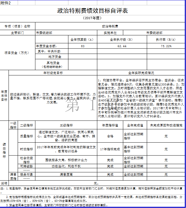 項目支出績效評價綜述:涉及1個項目,即政治特別費,共計83萬元。2017年實際執行62.44萬元,執行率75.22%,從評價情況來看,