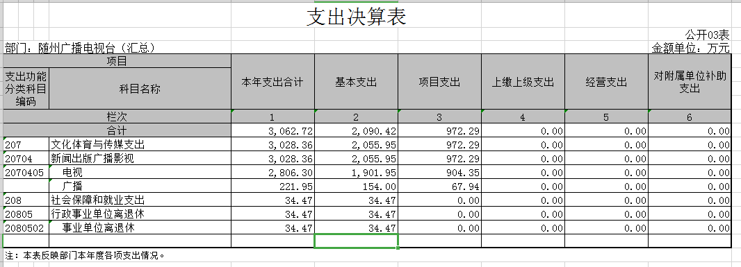 隨州廣播電視臺(本級)2017年支出合計2250.66萬元,較上年增加597萬元,增長36%,主要是人員支出和《魅力中國城》等突發性項目的增加,和2017年預算(2384.81萬元)相比減少134.15萬元,減少5.6%,其中基本支出1709.92萬元,項目支出540.74萬元。