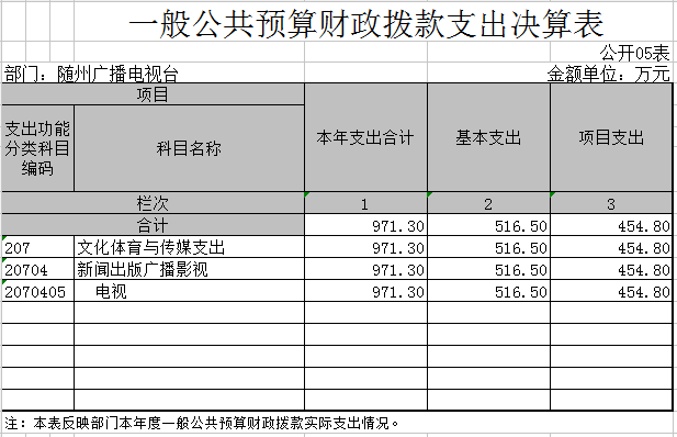 隨州廣播電視臺(本級)2017年財政撥款支出決算數971.3萬元,較上年增加484.41萬元,增加99.5%,和2017年預算(617.8萬元)相比增加353.5萬元,增加57.22%,主要原因是增加了《魅力中國城》等突發性項目支出,其中基本支出516.5萬元,項目支出454.8萬元。