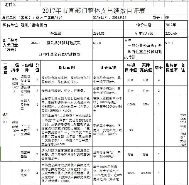 組織開展整體支出績效評價,從評價情況來看,2017年預算資金覆蓋廣電工作的各個需求方面,預算資金能保障單位正常運轉需要,能保障本部門及下屬二級單位按時按質完成市委市政府交辦的各項工作任務,保證優質安全播出。在預算執行過程中,嚴格按項目分類及資金性質進行管理,有效地利用財政性資金,完成了年初績效目標。