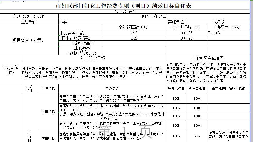 ??為進一步加強和規范婦女工作經費項目資金的管理,根據市財政局《市財政局關于2018年開展財政支出績效評價工作的通知》隨財發【2018】16號文件的精神和要求,市婦聯成立專班,組織相關專業人員對我單位整體支出情況及產生的社會效益進行了績效自評。根據預算績效管理要求,我會組織對2017年度一般公共預算全面開展績效自評,共涉及項目1個,2017年預算資金共計417.12萬元,2017年實際支出數366.05萬元,占一般公共預算支出總額的87.76%。