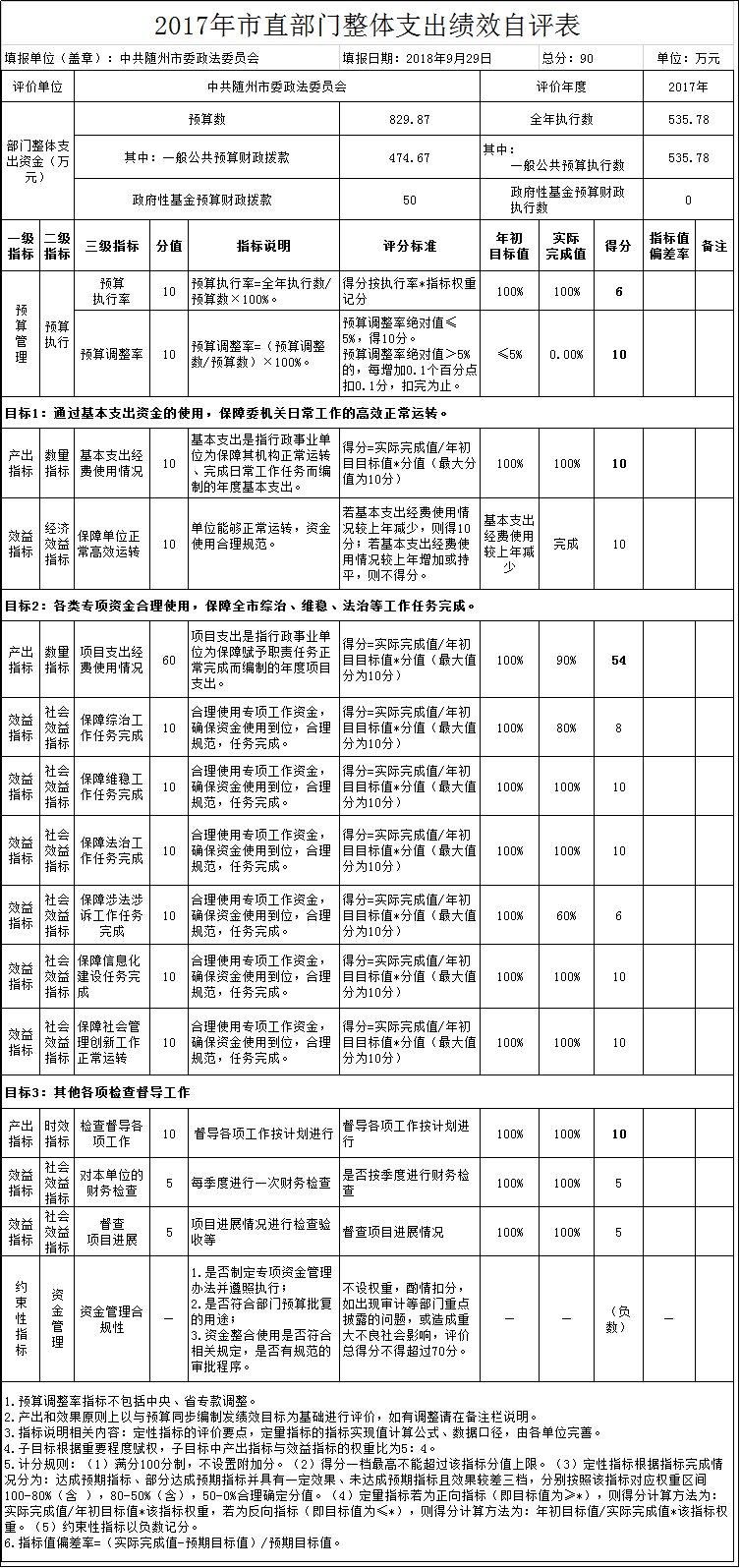 2017年度市委政法部門整體支出績效評價自評得分為 90分,績效等級為優(yōu)。2017年單位全年預(yù)算數(shù)收入829.87萬元,實際支出535.78萬元,完成預(yù)算64.56%。取得的主要成效:保障機(jī)構(gòu)正常運轉(zhuǎn)和年度工作任務(wù)完成,為隨州建設(shè)經(jīng)濟(jì)轉(zhuǎn)型升級和創(chuàng)新驅(qū)動示范城市、打造特色產(chǎn)業(yè)增長極提供了優(yōu)良的法治環(huán)境。存在的主要問題:項目年度預(yù)算執(zhí)行率偏低。其主要原因:一方面,我單位在支出過程中厲行節(jié)約,壓縮開支;另一方面,由于項目費用大部分用于保障基層基礎(chǔ)建設(shè),項目建設(shè)周期長且具有延續(xù)性,使得部分項目支出當(dāng)年不能全部完成,故預(yù)算執(zhí)行率偏低。下一步改進(jìn)措施:及時調(diào)整優(yōu)化后續(xù)項目及下年度預(yù)算支出的方向和結(jié)構(gòu),進(jìn)一步加強(qiáng)財務(wù)管理,規(guī)范資金使用,提高年度預(yù)算執(zhí)行率,特別是大力提高年度項目預(yù)算經(jīng)費的執(zhí)行率。