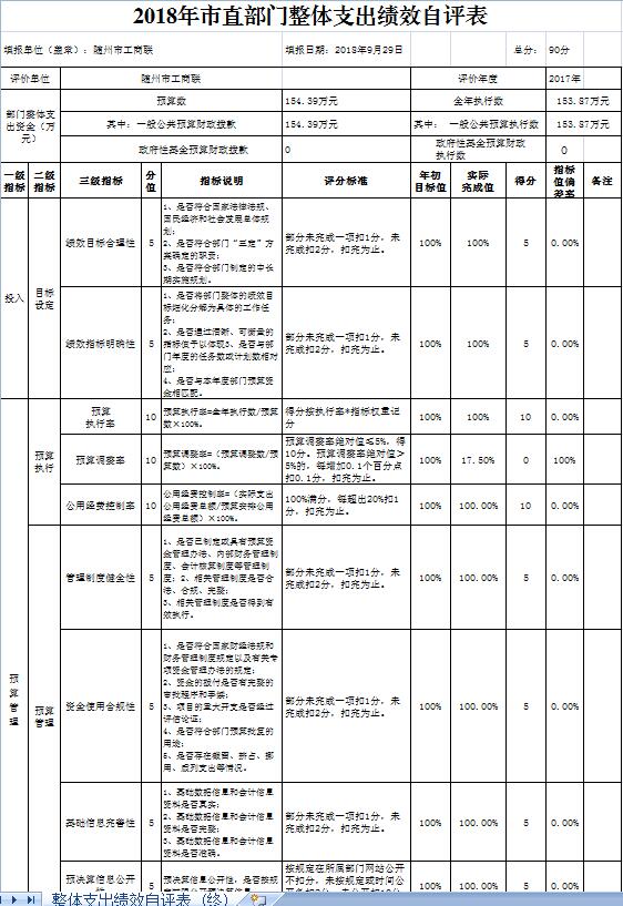 1、預算績效管理工作開展情況。根據預算績效管理要求,我單位組織開展了2017年度單位整體支出績效評價和2017年度一般公共預算項目支出全面開展績效自評。根據《市財政局關于2018年開展財政支出績效評價工作的通知》(隨財發〔2018〕16號)文件,并積極同市財政局銜接,我會確定了自評的項目,安排專人開展自評工作,認真填寫自評表,撰寫形成自評報告。