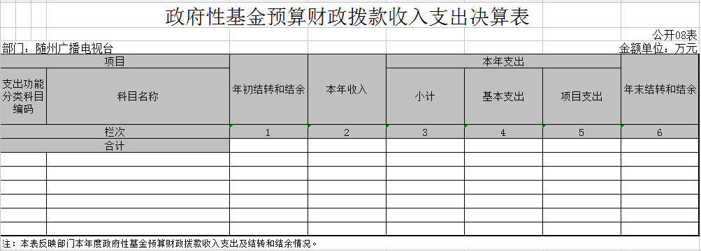 隨州廣播電視臺(tái)系統(tǒng)匯總及本級(jí)2017年無政府性基金預(yù)算收支,08表為空表,和上年同比無增減。
