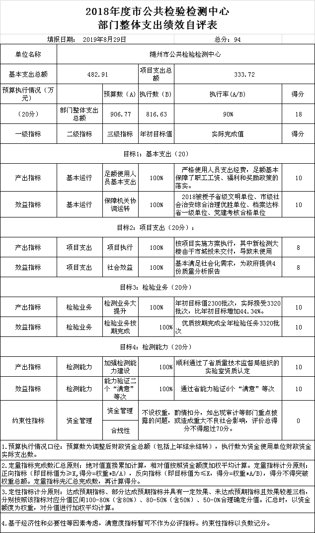 嚴格使用人員支出經費,基本保障了職工工資、福利和獎勵政策的落實,保障了機關協調運轉超額完成年度檢測任務目標,為政府提供4份質量分析報告,接受社會委托送檢,基本滿足社會化需求,加強崗位練兵,檢測能力顯著提升,為市政府出臺新的決策和措施發揮參謀助手作用,逐步邁入先進檢測機構行列。扣分項主要為二項,第一項是預算執行情況,年度預算906.77萬元,實際執行基本支出482.91萬元,項目支出333.72萬元,年度支出總額816.63萬元,執行率90%。扣2分;第二項為項目支出指標中完成情況:按項目實施方案執行,執行率達到90%。未達到的一項是未啟用檢測大樓。此項指標扣4分.產生的原因一是對績效目標的內涵缺乏深刻科學的認識,導致指標設置不夠合理;二是由于不可抗拒的因素,導致個別項目進度滯后,沒有如期完成,沒有產生社會效益。?