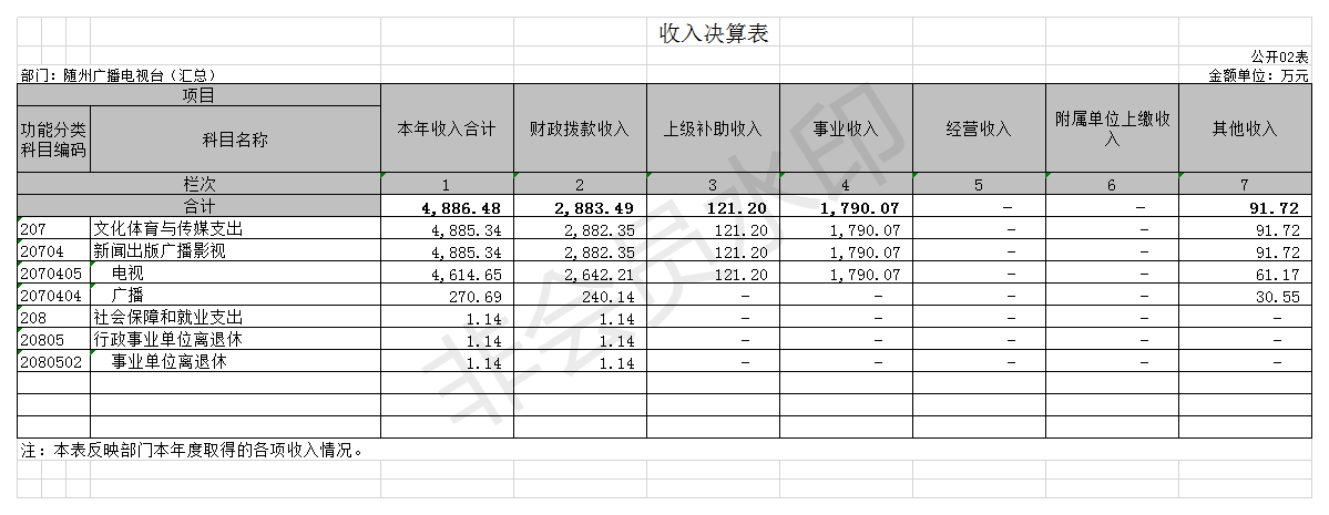 隨州廣播電視臺系統(tǒng)匯總2018年收入合計(jì)4886.48萬元,較上年(3333.95萬元)增加1552.53萬元,增加了46.57%,原因是2018年增加了人員經(jīng)費(fèi)和傳媒中心廣電設(shè)備資金1284萬元財(cái)政撥款,與2018年預(yù)算收入合計(jì)(3795.82萬元)相比增加了1090.66萬元,增加了28.73%。其中財(cái)政撥款2883.49萬元,較上年(1978.05萬元)增加了905.44萬元,原因是增加了人員經(jīng)費(fèi)撥款和傳媒中心廣電設(shè)備資金1284萬元,下屬二級單位發(fā)射臺減少了基建工程項(xiàng)目撥款120萬元和省無線覆蓋專項(xiàng)資金近70萬元;上級補(bǔ)助收入121.2萬元,事業(yè)收入1790.07萬元,其他收入91.72萬元。