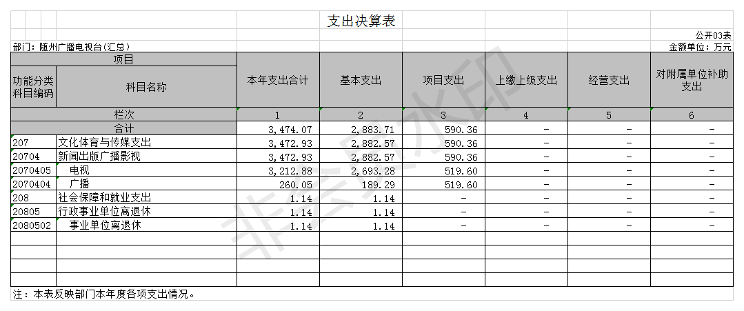 隨州廣播電視臺系統(tǒng)匯總2018年支出合計(jì)3474.07萬元,較上年(3062.72萬元)增加411.35萬元,增長13.43%,主要是政策性增資(人員支出),與2018年預(yù)算(3852.61萬元)相比減少378.54萬元,主要是傳媒中心廣電設(shè)備資金支付后因票據(jù)未收回,作掛賬處理,其中基本支出2883.71萬元,項(xiàng)目支出590.36萬元。