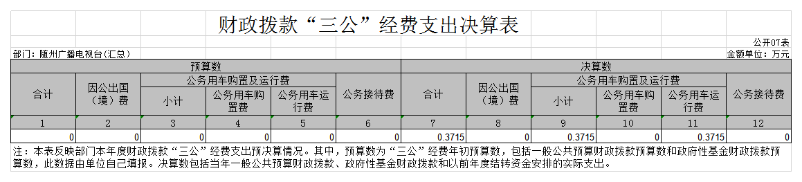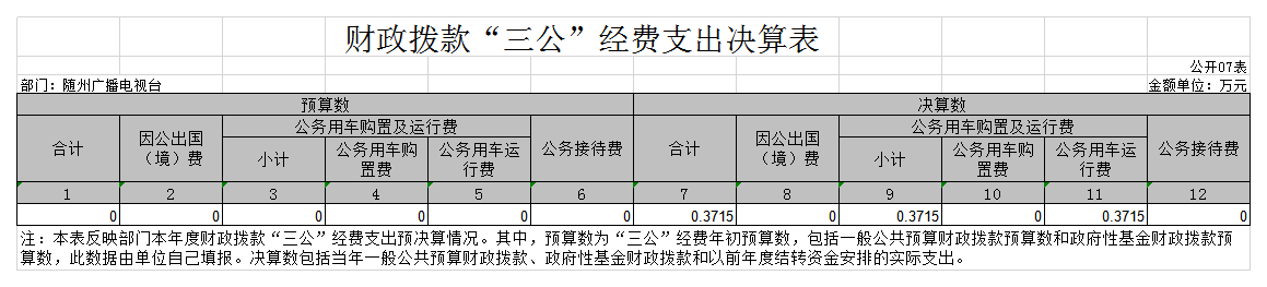 隨州廣播電視臺系統(tǒng)匯總2018年度財(cái)政撥款“三公”經(jīng)費(fèi)支出0.37萬元,上年度財(cái)政撥款“三公經(jīng)費(fèi)”支出為0,年初預(yù)算數(shù)為0,較上年增加0.37萬元,原因是2018年財(cái)政撥款“三公”經(jīng)費(fèi)支出用于財(cái)政撥款項(xiàng)目“扶貧領(lǐng)域電視問政”項(xiàng)目中公務(wù)車費(fèi)用0.37萬元,本項(xiàng)目為2018年臨時(shí)追加項(xiàng)目,年初未列入當(dāng)年預(yù)算支出。