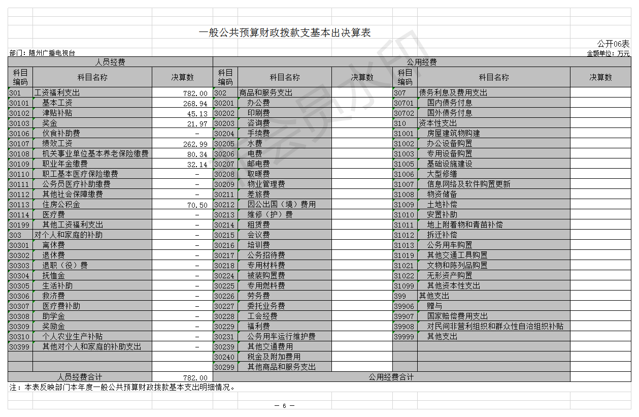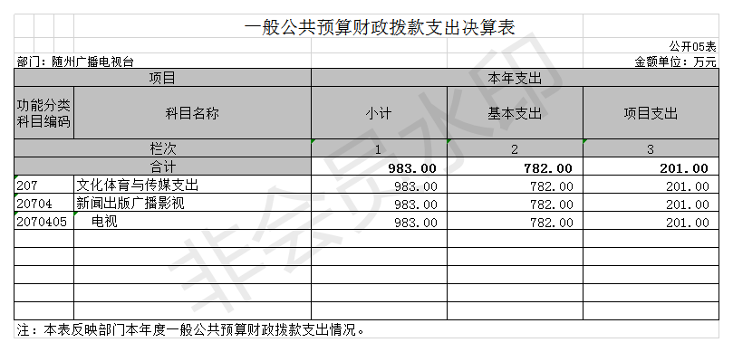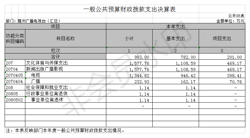 隨州廣播電視臺(本級)2018年財(cái)政撥款支出決算數(shù)983萬元,較上年(971.3萬元)增加11.7萬元,增加1.2%,與2018年預(yù)算(2015萬元)相比減少1043.7萬元,主要原因是傳媒中心廣電設(shè)備資金支付后因票據(jù)未收回,作掛賬處理,未記入2018年財(cái)政撥款支出。其中基本支出782萬元,項(xiàng)目支出201萬元。