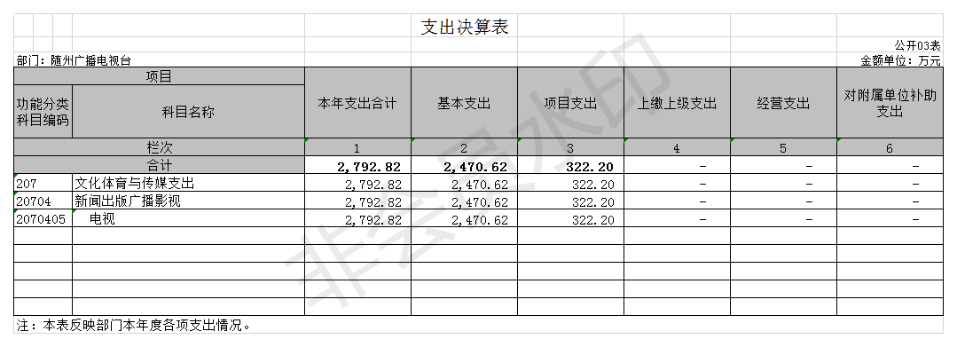 隨州廣播電視臺(本級)2018年支出合計(jì)2792.82萬元,較上年(2250.66萬元)增加542.16萬元,增長24.09%,主要是人員支出和《魅力中國城》等突發(fā)性項(xiàng)目的增加,與2018年預(yù)算(3239.3萬元)相比減少446.48萬元,原因是傳媒中心廣電設(shè)備資金支付后因票據(jù)未收回,作掛賬處理,其中基本支出2470.62萬元,項(xiàng)目支出322.2萬元。