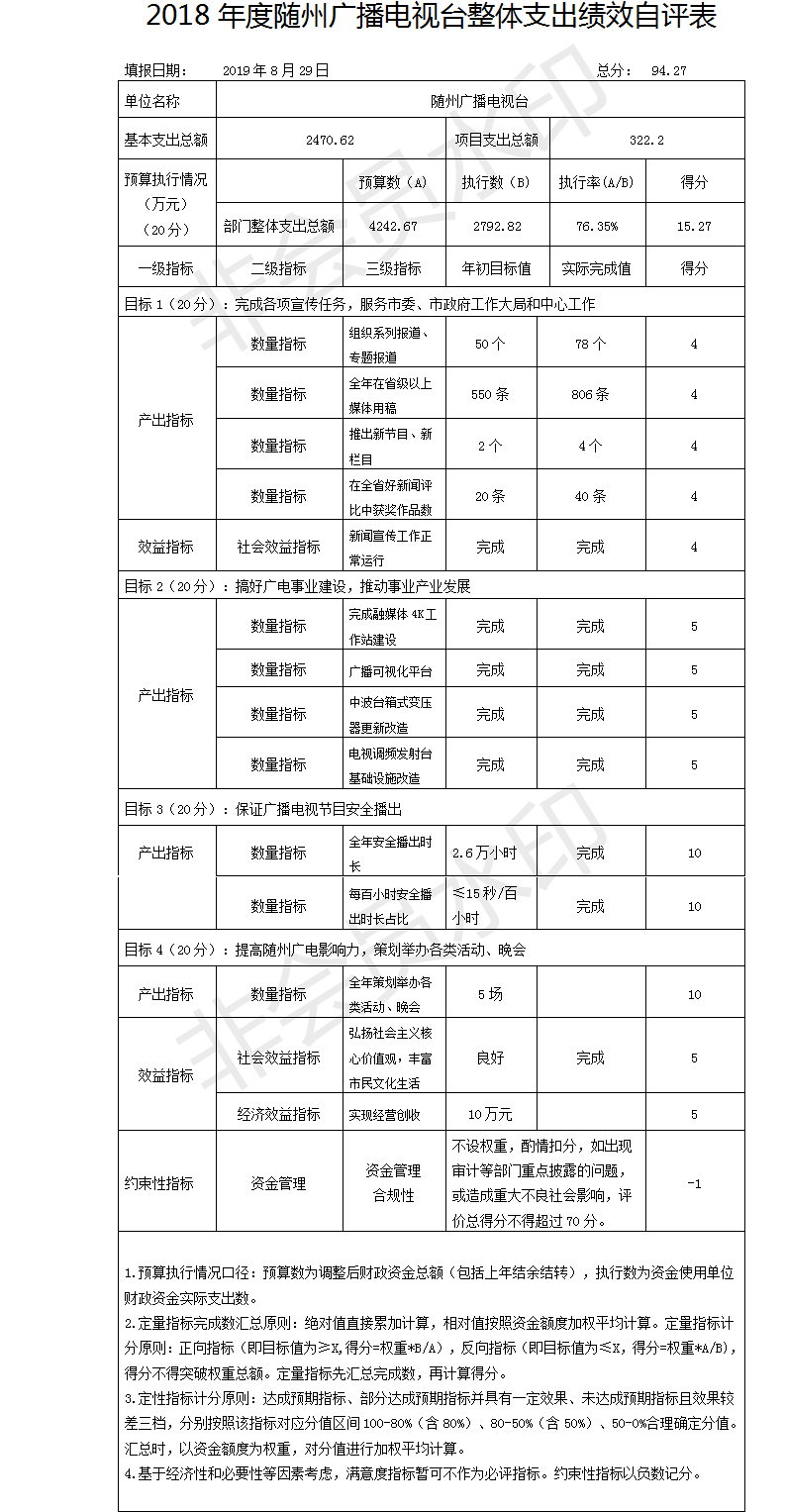 2、組織開展整體支出績效評價(jià),從評價(jià)情況來看,2018年預(yù)算資金覆蓋廣電工作的各個(gè)需求方面,保證優(yōu)質(zhì)安全播出。在預(yù)算執(zhí)行過程中,嚴(yán)格按項(xiàng)目分類及資金性質(zhì)進(jìn)行管理,有效地利用財(cái)政性資金,完成了年初績效目標(biāo),按時(shí)按質(zhì)完成市委市政府交辦的各項(xiàng)工作任務(wù)。經(jīng)績效自評,我臺2018年度整體支出績效自評分94.27分。