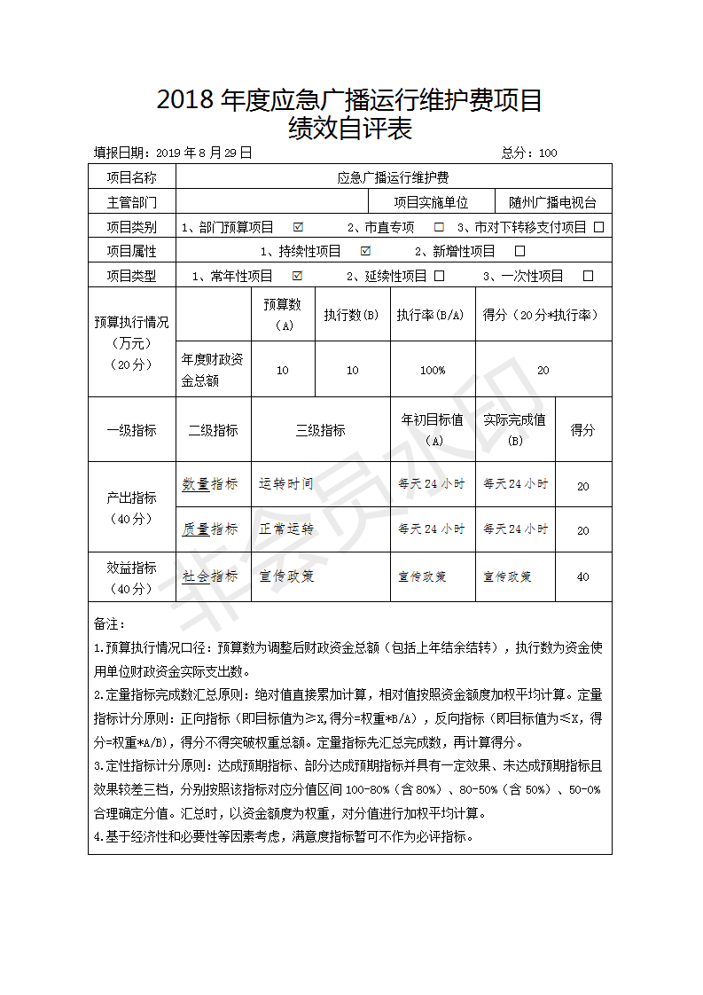 (3)應(yīng)急廣播市級平臺運(yùn)行維護(hù)費(fèi)10萬元,用于支付應(yīng)急廣播的網(wǎng)絡(luò)運(yùn)行費(fèi)用、設(shè)備維護(hù)費(fèi)用等。年初制度績效目標(biāo)為完成市級平臺建設(shè),全天24小時(shí)不間斷播出,充分發(fā)揮應(yīng)急廣播的輿論導(dǎo)向和應(yīng)急響應(yīng)作用,至2018年底,已完成績效目標(biāo)任務(wù)。