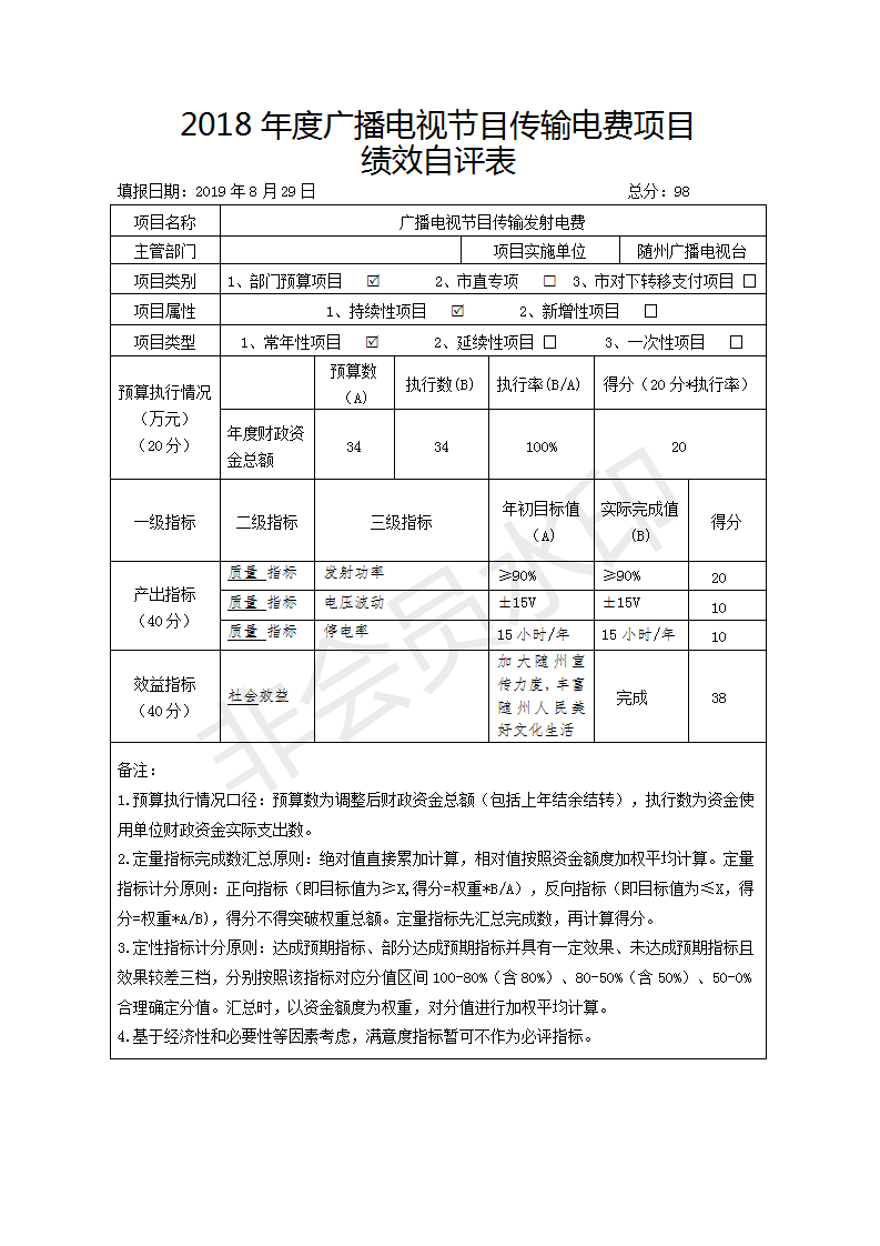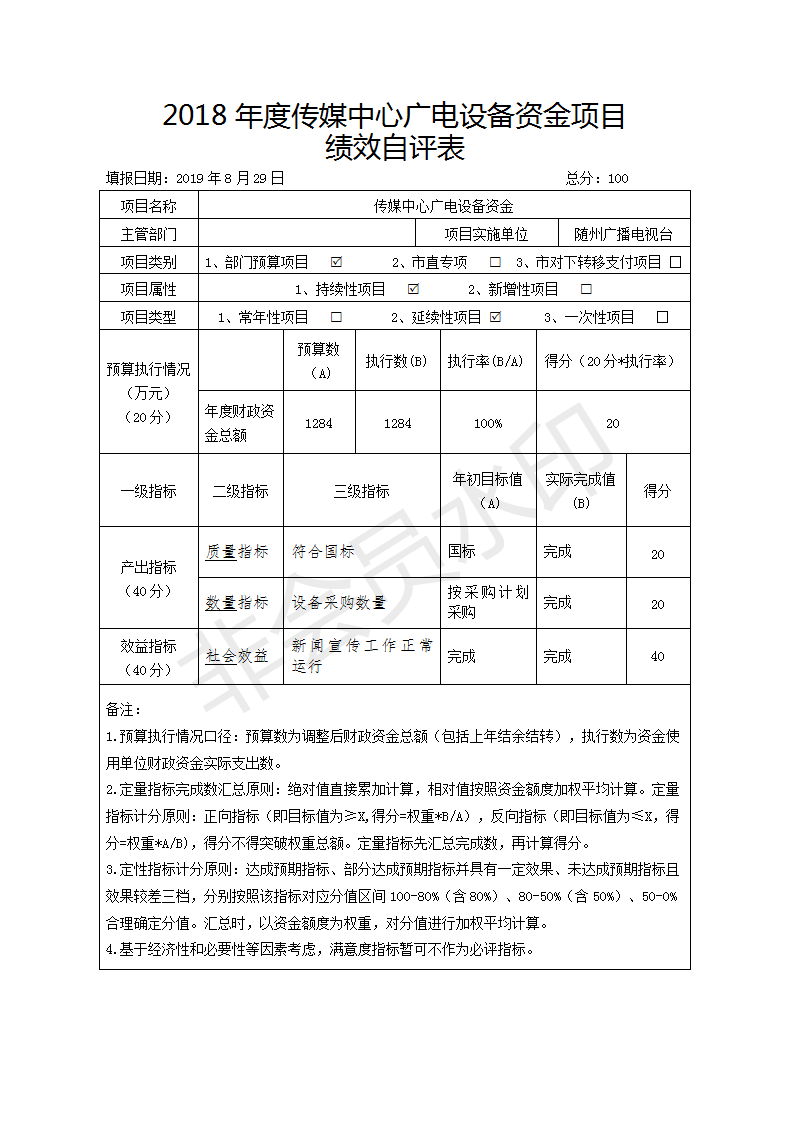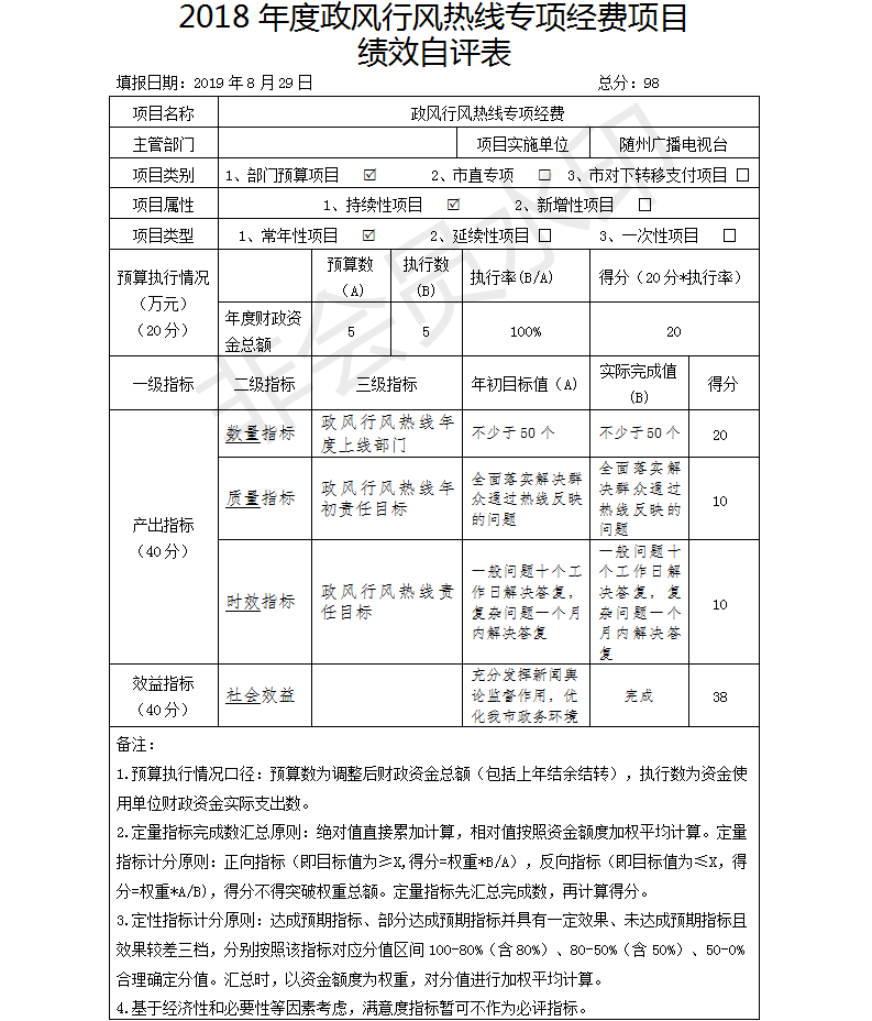 根據(jù)預(yù)算績效管理要求,隨州廣播電視臺組織對2018年度一般公共預(yù)算項(xiàng)目支出全面開展績效自評,共涉及5個(gè)項(xiàng)目,資金1383萬元,分別是: