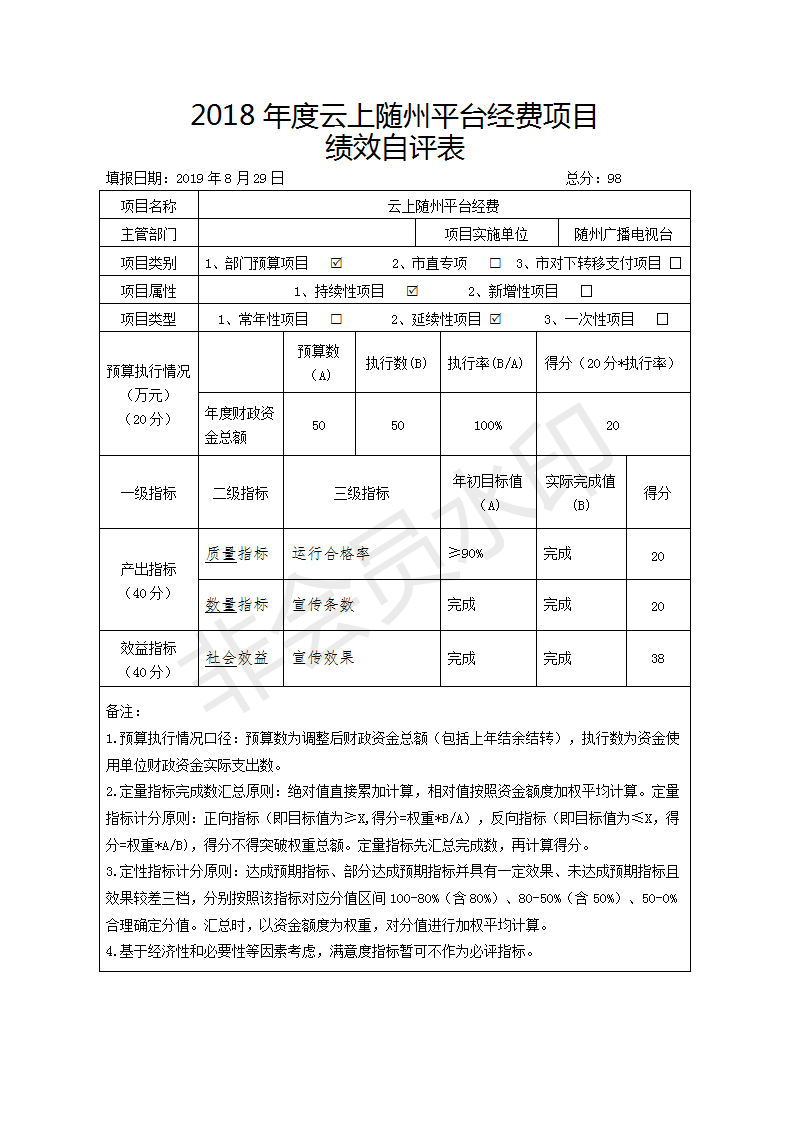 (4)云上隨州平臺經(jīng)費(fèi)50萬元,其中上交省帶寬租用費(fèi)38萬元,維護(hù)費(fèi)用12萬元。年初績效目標(biāo)為完成平臺搭建,充分發(fā)揮平臺的新聞宣傳和政務(wù)服務(wù)功能,2018年底,我臺已完成平臺建設(shè),并正常運(yùn)行和維護(hù),完成績效目標(biāo)任務(wù)。
