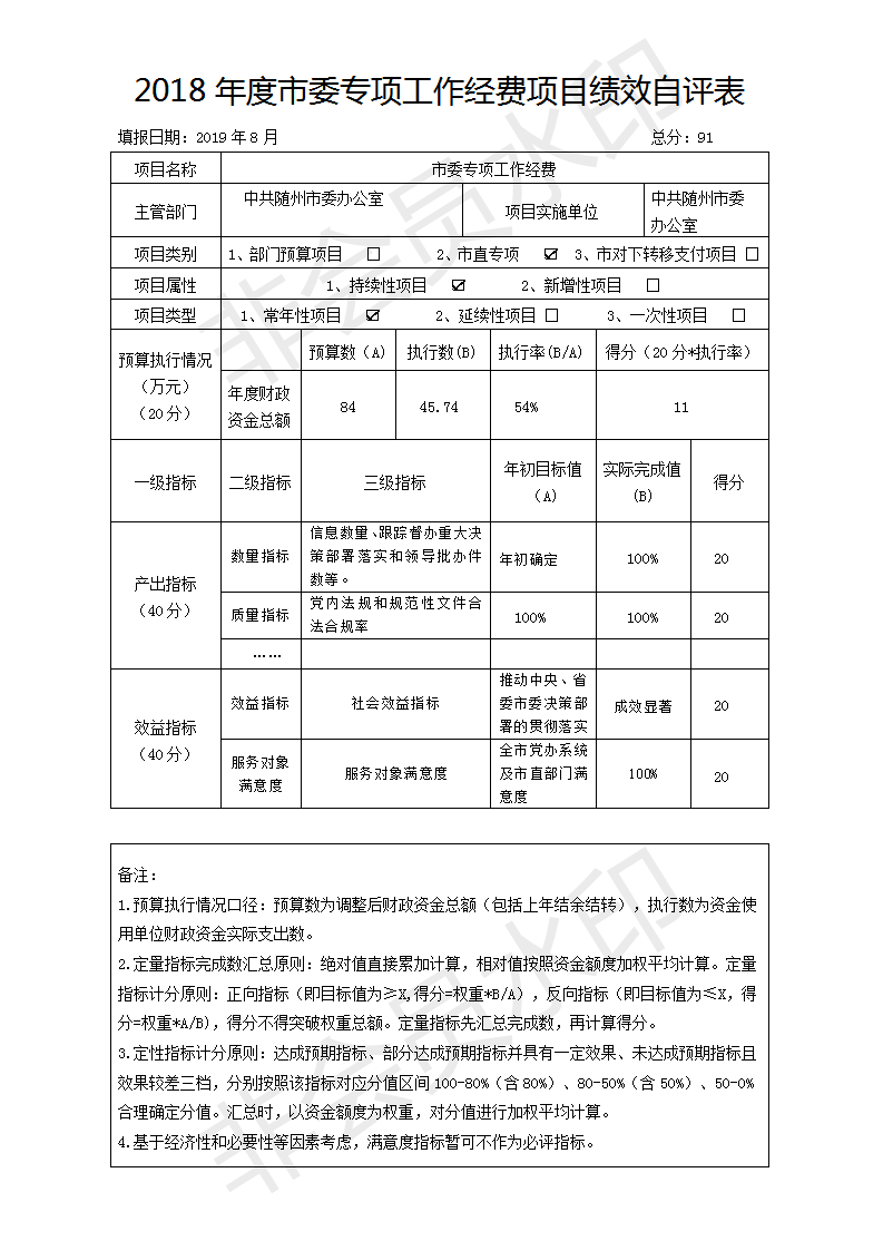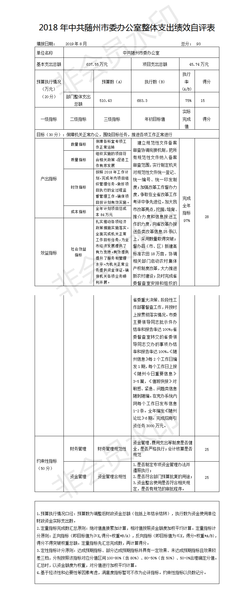6、關于2018年度預算績效情況的說明。根據預算績效管理要求,我單位對2018年度一般公共預算項目支出全面開展了績效自評,共涉及項目1個(市委專項工作經費),資金84萬元,專項資金到位率和及時率為100%。本著節約原則,我辦從嚴控制經費支出,力求把專項經費用在刀刃上,實際支出45.74萬元,沒有出現超支現象。主要產出和效果:一是積極服務市委領導開展調查研究工作,組織了專題調研4次以上,調研成果采納率達100%;二是跟蹤督辦重大決策部署落實和領導批辦件達到100%;三是黨內法規和規范性文件合法合規率達到100%。在資金使用方面,嚴格制定和執行了財務管理核算制度,資金使用規范,相關資料齊全,無挪用、截留經費的情況發生。在專項資金管理方面,建立了嚴格的資金管理制度,提高了監管水平。專項資金保質保量、規范高效的實施,加強了領導干部思想政治建設,提高了干部職工的理論水平和工作能力,保障了各科室專項業務的正常運轉。