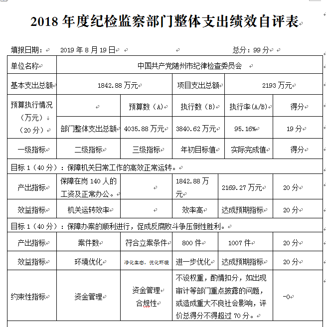 綜上,2018年度我委整體支出績效自評(píng)得分為99分。