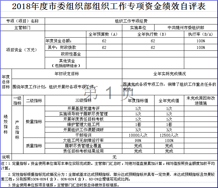??組織工作專項(xiàng)經(jīng)費(fèi)項(xiàng)目績(jī)效自評(píng)綜述:項(xiàng)目全年預(yù)算數(shù)為62萬(wàn)元,執(zhí)行數(shù)為62萬(wàn)元,完成預(yù)算的100%。主要產(chǎn)出和效果:圍繞年度工作計(jì)劃,領(lǐng)導(dǎo)班子和領(lǐng)導(dǎo)干部履職盡責(zé)管理、黨建考評(píng)迎檢、責(zé)任目標(biāo)考核、干部人事制度改革、組織工作課題調(diào)研、干部培訓(xùn)教育、大組工網(wǎng)維護(hù)等工作完成較好,成效比較明顯,有力保障了全年組織工作重點(diǎn)任務(wù)的完成。發(fā)現(xiàn)的問題及原因:項(xiàng)目設(shè)置不夠細(xì)化。主要原因是根據(jù)承擔(dān)工作進(jìn)行大項(xiàng)設(shè)置,沒有細(xì)化到具體工作項(xiàng)目。下一步改進(jìn)措施:結(jié)合工作實(shí)際,進(jìn)一步合理設(shè)置項(xiàng)目。