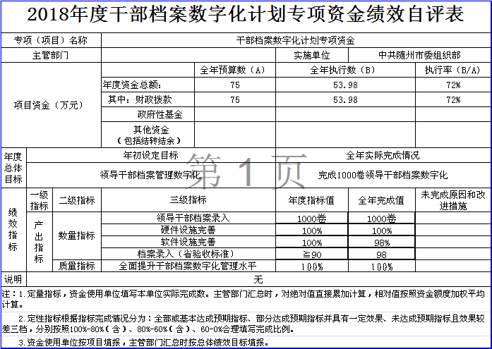??干部檔案數(shù)字化項(xiàng)目績(jī)效自評(píng)綜述:項(xiàng)目全年預(yù)算數(shù)為75萬(wàn)元,執(zhí)行數(shù)為53.98萬(wàn)元,完成預(yù)算的72%。主要產(chǎn)出和效果:最大限度地開發(fā)干部檔案信息資源,全面提升干部人事檔案管理工作信息化、科學(xué)化水平,我市1000多名領(lǐng)導(dǎo)干部檔案全部實(shí)現(xiàn)了數(shù)字化標(biāo)準(zhǔn)管理。發(fā)現(xiàn)的問題及原因:年度資金實(shí)際支出少于預(yù)算金額。主要原因是:項(xiàng)目實(shí)施后通過驗(yàn)收有一定期限,部分資金需后續(xù)撥付。下一步改進(jìn)措施:根據(jù)工作進(jìn)展情況及時(shí)撥付相關(guān)資金。