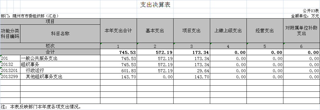 ??隨州市委組織部2018年度部門(匯總)支出總計(jì)843.42萬(wàn)元,其中本年支出合計(jì)745.53萬(wàn)元,較上年上升2.55%,主要原因是:本年度支出與上年基本持平;年末結(jié)轉(zhuǎn)和結(jié)余97.89萬(wàn)元,較上年下降48.26%,主要原因是:2017年度延續(xù)項(xiàng)目在本年度支出。