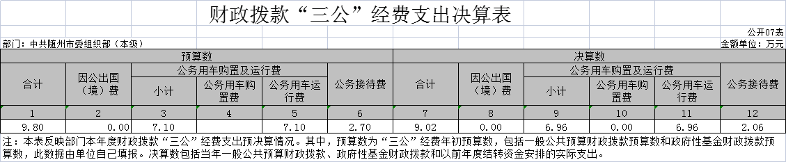 ??隨州市委組織部部門(本級(jí))一般公共預(yù)算財(cái)政撥款“三公”經(jīng)費(fèi)支出年初預(yù)算數(shù)為9.8萬(wàn)元,決算數(shù)為9.02萬(wàn)元,完成預(yù)算的92.04%,決算數(shù)較上年下降46.63%,其中:(1)2018年度本部門無(wú)因公出國(guó)(境)情況。因公出國(guó)(境)支出年初預(yù)算數(shù)為0萬(wàn)元,決算數(shù)為0萬(wàn)元。(2)2018年度本部門國(guó)內(nèi)公務(wù)接待45個(gè)批次196人次。公務(wù)接待費(fèi)支出年初預(yù)算數(shù)為2.7萬(wàn)元,決算數(shù)為2.06萬(wàn)元,完成預(yù)算的76.29%,決算數(shù)較上年下降66.73%。主要原因是:嚴(yán)格執(zhí)行中央八項(xiàng)規(guī)定,嚴(yán)控經(jīng)費(fèi)支出。(3)2018年度本部門公務(wù)用車保有量2臺(tái),沒有新購(gòu)置公務(wù)用車。公務(wù)用車購(gòu)置及運(yùn)行維護(hù)費(fèi)支出年初預(yù)算數(shù)為7.1萬(wàn)元,其中公務(wù)用車購(gòu)置年初預(yù)算數(shù)為0萬(wàn)元,決算數(shù)為0萬(wàn)元。公務(wù)用車運(yùn)行維護(hù)費(fèi)年初預(yù)算數(shù)為7.1萬(wàn)元,決算數(shù)為6.96萬(wàn)元,完成預(yù)算的98.03%,決算數(shù)較上年下降35.05%。主要原因是:嚴(yán)格執(zhí)行中央八項(xiàng)規(guī)定,嚴(yán)控經(jīng)費(fèi)支出。