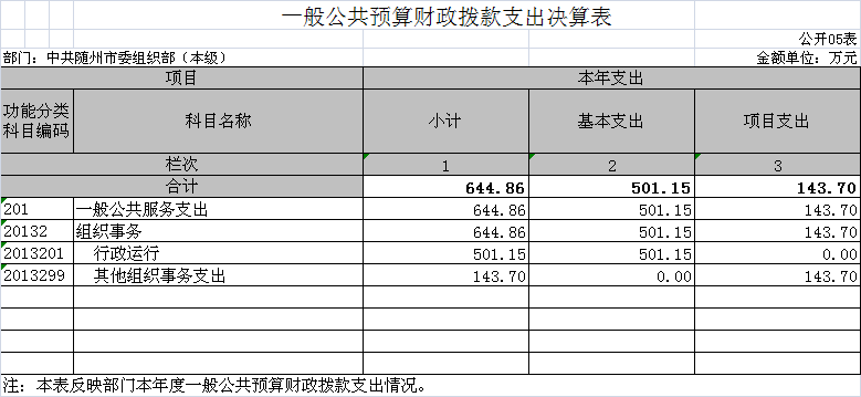 ??隨州市委組織部2018年度部門(匯總)財(cái)政撥款支出年初預(yù)算數(shù)為543.63萬(wàn)元,決算數(shù)為745.53萬(wàn)元,完成年初預(yù)算的100%,主要原因是:部分工作計(jì)劃調(diào)整以及人員支出增加。