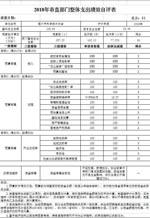 附1、2018年度隨州市科學技術協會整體支出績效自評表