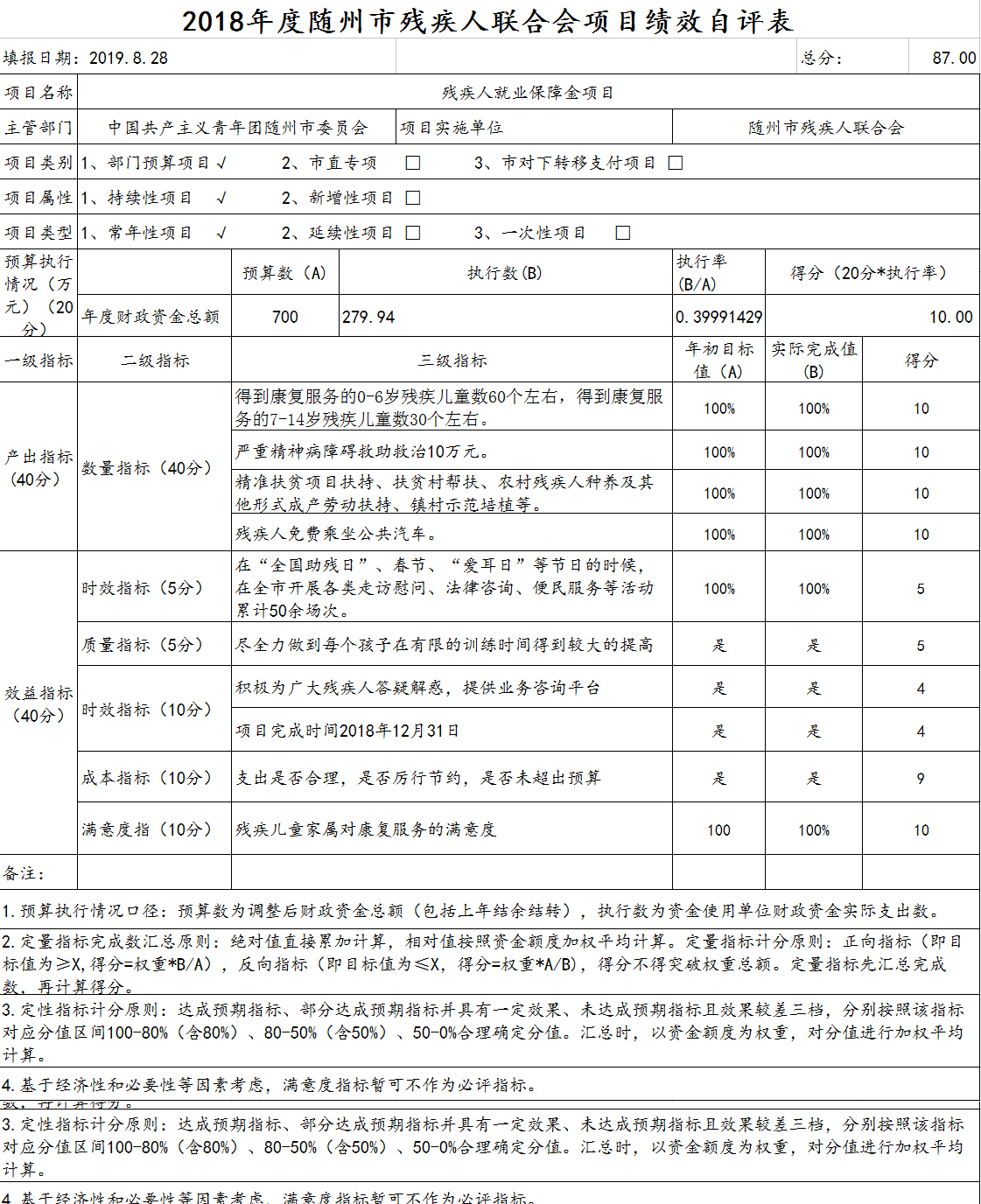根據預算績效管理要求, 2018年我單位預算項目6個,項目名稱分別為:殘疾人就業保障金支出項目、殘疾人事業支出項目(財政撥款補助)、福彩項目、特困殘疾人生活救助、陽光家園(托養服務)、0-6歲殘疾兒童搶救性康復。2018年項目預算數共計721萬元,收入完成數共計326萬元(其中撥付市殘聯機關165萬元,市殘疾人就業服務中心60萬元,高新區殘聯20萬元,嚴重精神病障礙救助救治10萬元,殘疾人免費乘車補助50萬元)。