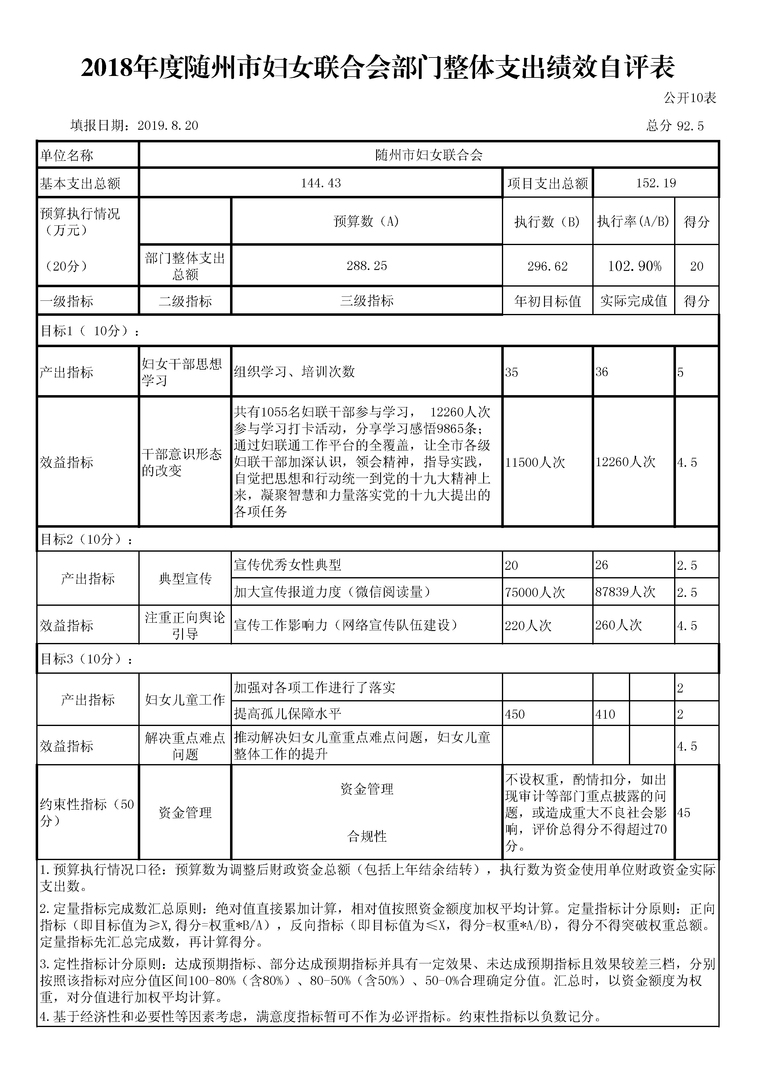 為進一步加強和規范婦女工作經費項目資金的管理,根據市財政局《市財政局關于2018年開展財政支出績效評價工作的通知》隨財發【2019】9號文件的精神和要求,市婦聯成立專班,組織相關專業人員對我單位整體支出情況及產生的社會效益進行了績效自評。根據預算績效管理要求,我會組織對2018年度一般公共預算全面開展績效自評,2018年年初預算資金共計288.25萬元,2018年實際收到資金308.26萬元,實際支出數296.62萬元,一般公共預算支出261.63萬元占支出總額的88.20%。從評價情況來看,我會2018年度部門整體支出績效評價自評結果為“優秀”。
