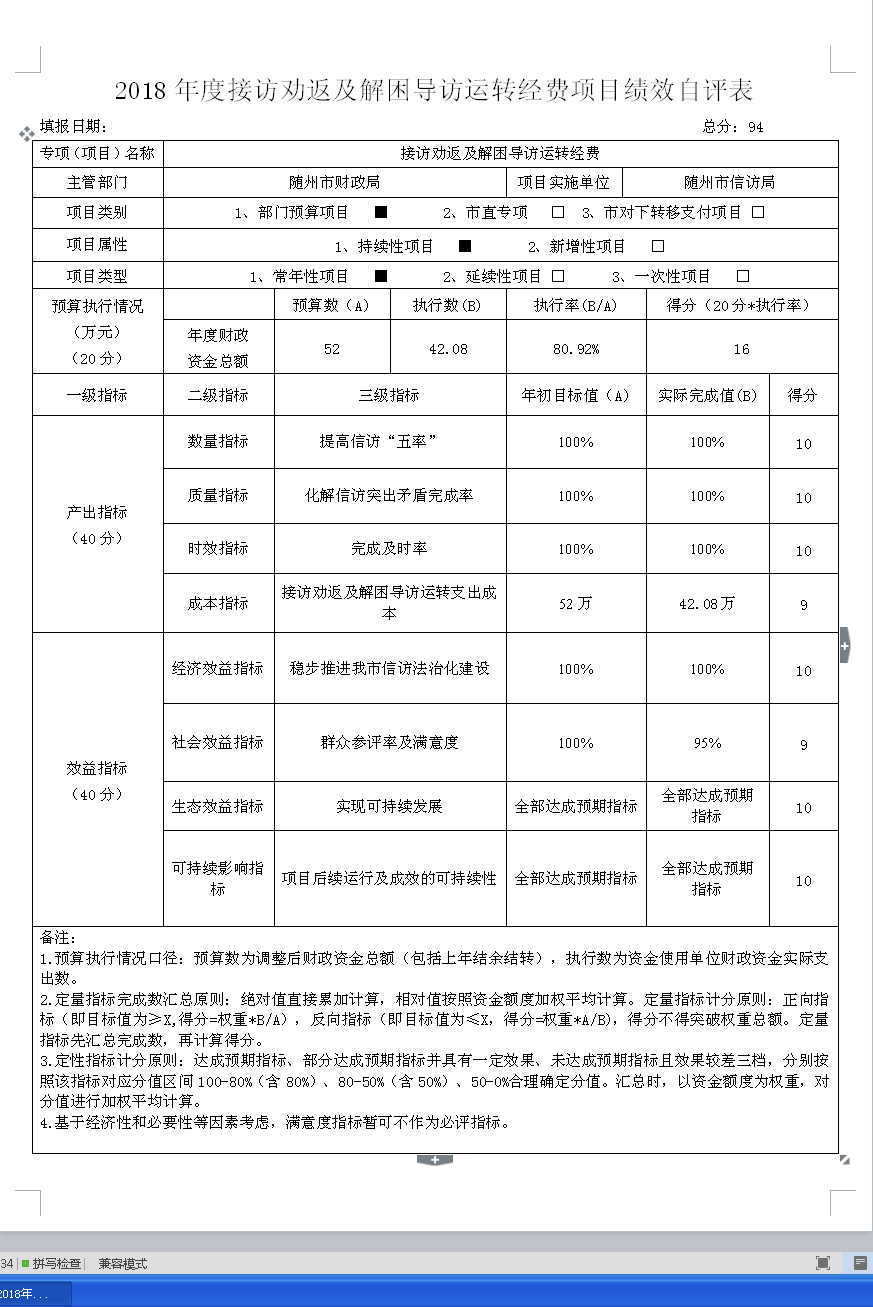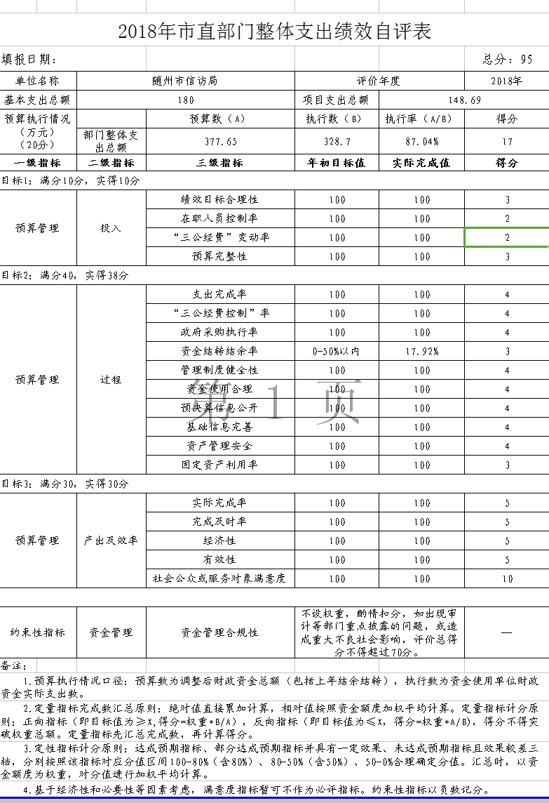 組織開展部門整體支出績效評價自評分為95分。從產(chǎn)出指標完成情況分析:一是推動落實信訪工作主體責(zé)任;二是提高信訪“五率”和網(wǎng)訪占比;三是維護正常信訪秩序。從效益指標完成情況分析:一是化解信訪突出矛盾,二是推進信訪工作制度改革。