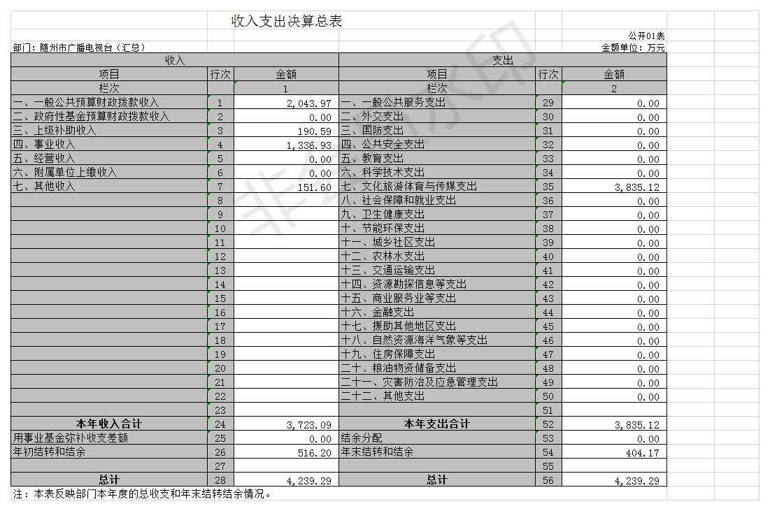 隨州廣播電視臺系統匯總2019年收入合計4239.29萬元[較2018年決算收入(4886.48萬元)減少647.19萬元,減少了13.24%,原因是2019年減少了傳媒中心廣電設備資金634萬元財政撥款,與2019年預算收入合計(4590.71萬元)相比減少了351.42萬元,減少了7.66%]。其中財政撥款2043.97萬元,較2018年(2883.49萬元)減少了839.52萬元,主要原因是減少了傳媒中心廣電設備資金634萬元,下屬二級單位減少省無線覆蓋專項資金;上級補助收入190.59萬元;事業收入1336.93萬元;其他收入151.6萬元;上年結轉516.2萬元。