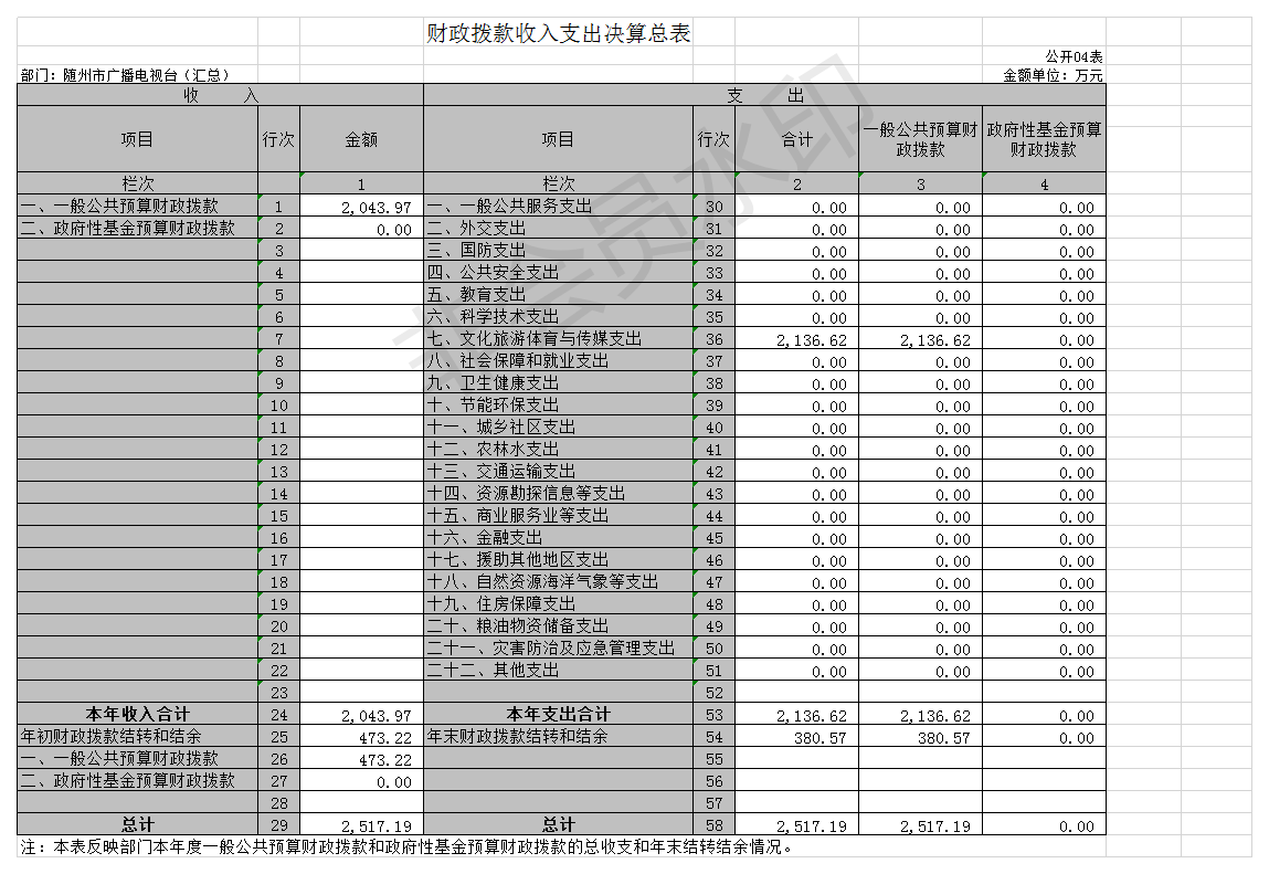 本系統納入部門預算管理的單位有隨州廣播電視臺、隨州市電視調頻發射臺、隨州市中波實驗臺三個單位。隨州廣播電視臺設辦公室、總編室、人力資源部、計劃財務部、新聞中心、節目中心、技術播控中心、應急廣播中心、大型活動中心、新媒體中心、外宣通聯部、廣告運營中心、廣播新聞綜合頻率、廣播交通經濟頻率、電視新聞綜合頻道、電視農村頻道、電視都市頻道17個內設機構,隨州廣播電視臺事業編制158名(其中從原廣電局劃轉2名)。截止2019年底,隨州廣播電視臺實有人數183人,其中參公管理編制2人,財政全額預算保障編制37人,一般公共預算財政撥款(補助)119人,臺聘人員(非在編人員)25人。另外退休干部職工31人。