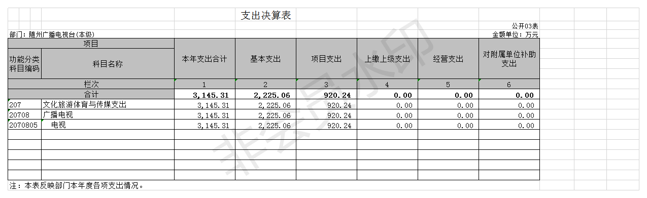 隨州廣播電視臺(本級)2019年支出合計3145.31萬元,較上年(2792.82萬元)增加352.49萬元,增長12.62%,主要是2018年傳媒設備資金1284未計入當年支出(作掛賬處理),完成老項目“村村響”支出及新增“改革開放40周年致敬隨州典型代表人物盛典”活動費用,與2019年預算(3853.53萬元)相比減少708.22萬元,原因是傳媒中心演播區域裝修進度滯后,設備無法進場導致未進行支付廣電設備預算資金,由財政部門調節804萬元統籌安排。其中基本支出2225.06萬元,項目支出920.24萬元。