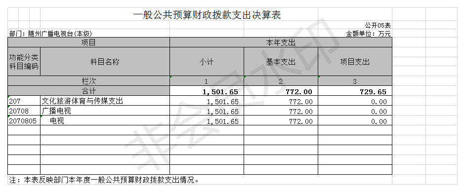 隨州廣播電視臺(本級)2019年財政撥款支出決算數1501.65萬元,較上年(983萬元)增加518.65萬元,增加52.76%,與2019年預算(2132萬元)相比減少630.35萬元,主要原因是傳媒中心演播區域裝修進度滯后,設備無法進場導致未進行支付廣電設備預算資金,由財政部門調節804萬元統籌安排。其中基本支出772萬元,項目支出729.65萬元。