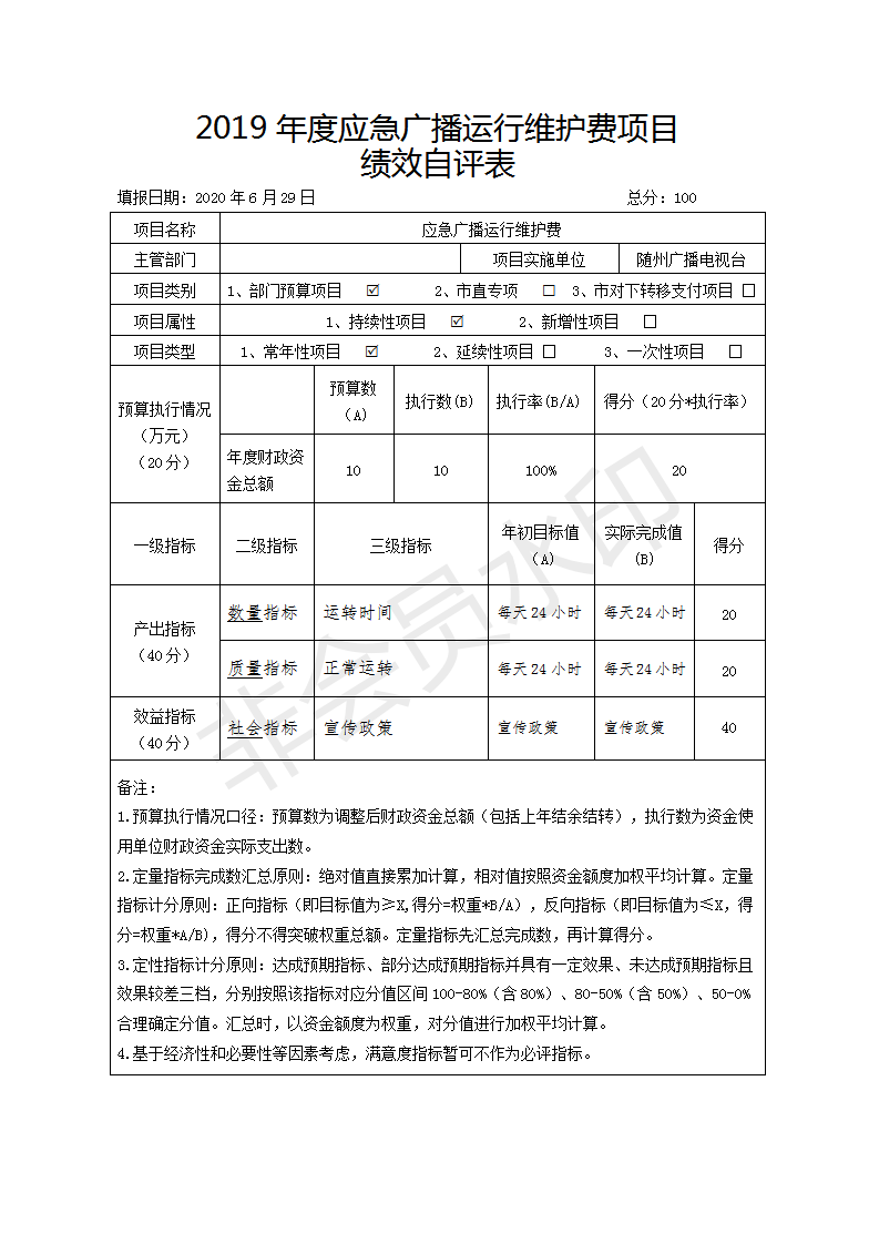 (3)應急廣播市級平臺運行維護費10萬元,用于支付應急廣播的網絡運行費用、設備維護費用等。年初制度績效目標為完成市級應急廣播平臺的安全高效運行,充分發揮應急廣播平時服務、戰時應急的服務職能,至2019年底,已完成績效目標任務。